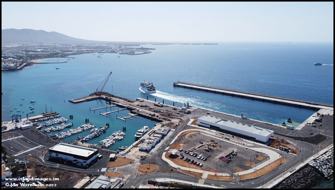 The port area with the Armas Ro-Ro ferry 'Volcan de Tindaya' leaving for Fuerterventura. Although not quite completed, commercial operations have all moved to the new harbour area with the old one being converted to a marina.