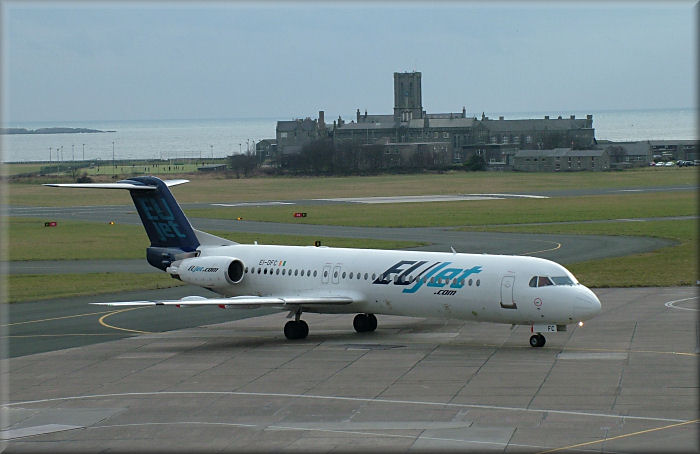 EUJet Fokker 100, EI-DFC, arrives from Newquay in Cornwall with a film crew.