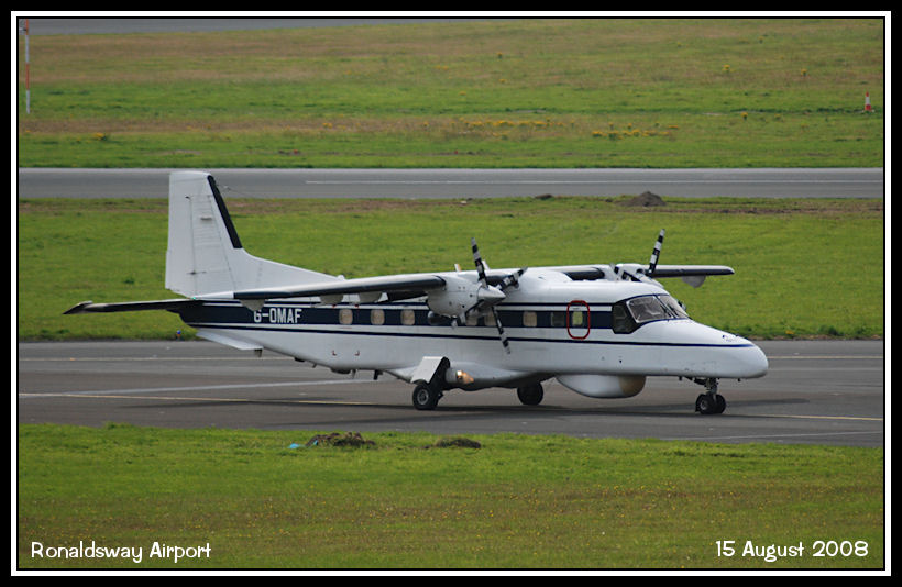 Dornier 228, G-OMAF, taxies in after arriving for fuel