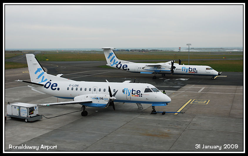 Loganair's Saab 340 G-LGNI and FlyBe's Dash8-Q400 G-KKEV on the east apron