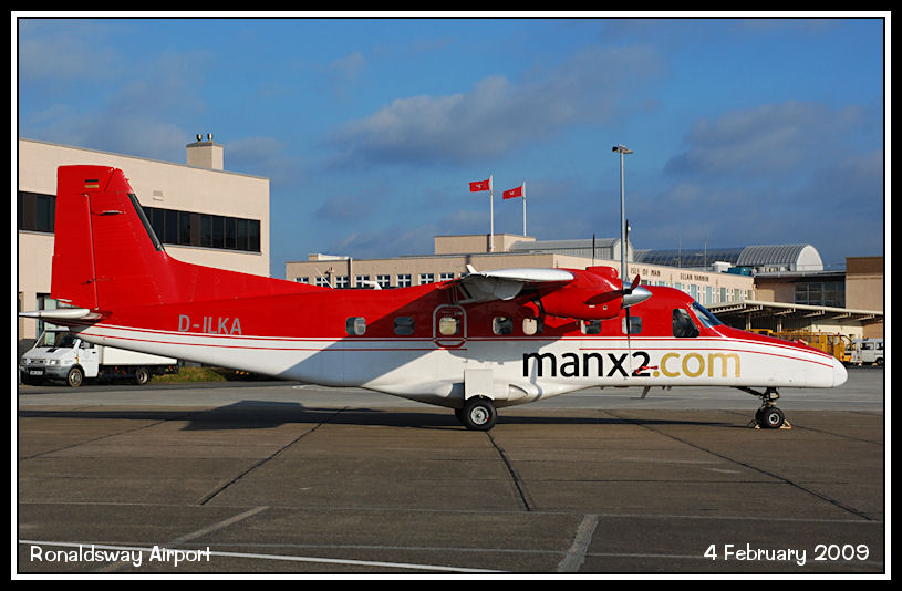 Manx2 Dornier 228 D-ILKA on the west apron with the main terminal behind