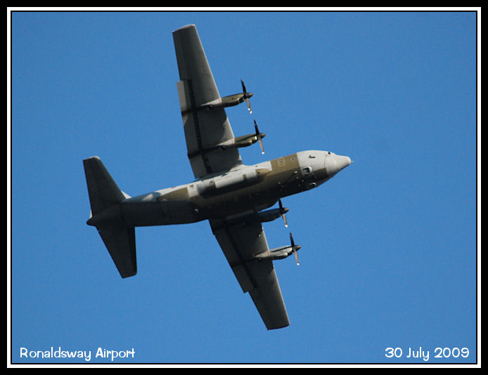 RAF C130J Hercules ZH882 passes overhead the airfield
