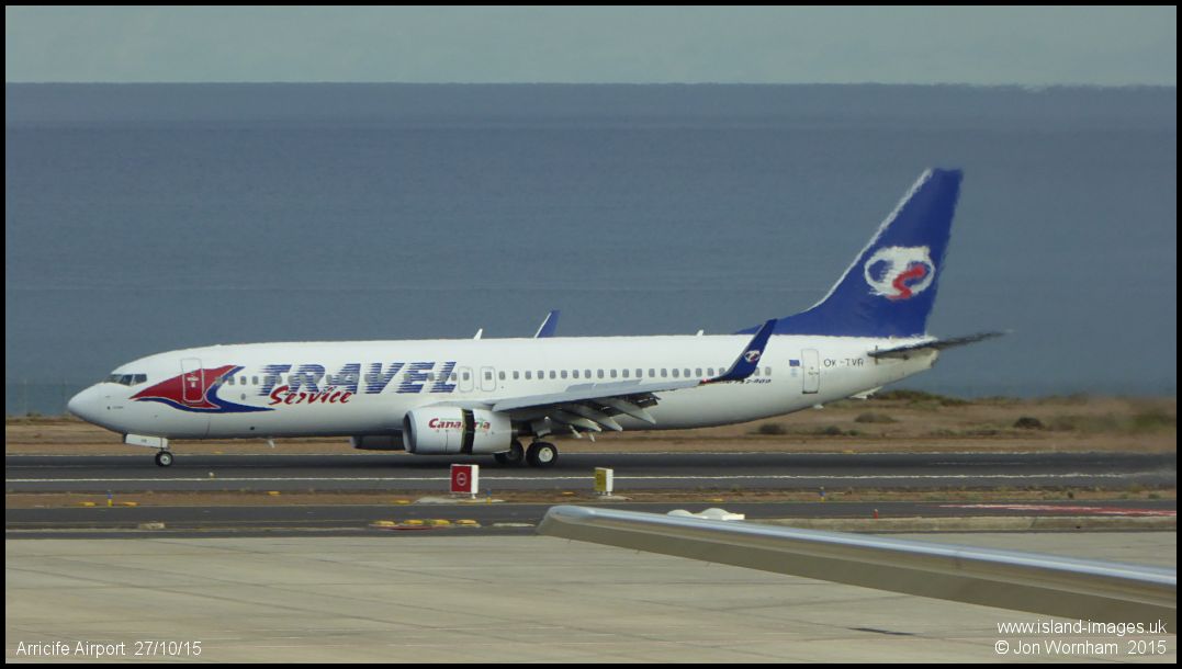 Travel Service Boeing 737-800 OK-TVR after landing on Arricife's runway 03