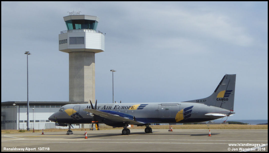 West Air ATP-F SE-KXP parked for the day on the east apron with Ronaldsway control tower as backdrop.