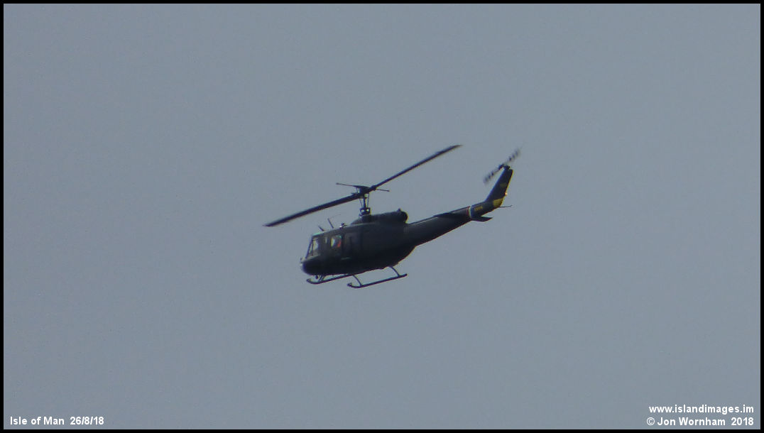 Former US Army UH1H Huey 72-21509 passes over the island en-route to Ronaldsway from a display at Jurby Airfield.