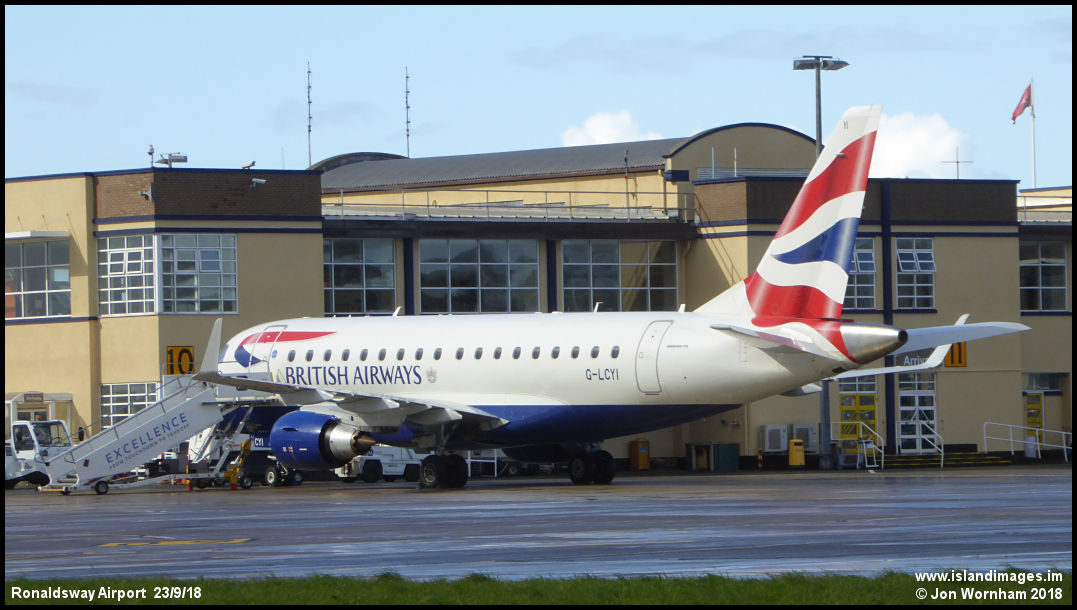 BA Cityflyer ERJ170 G-LCYI parked on the east apron on a Sunday morning after operating the Saturday flight to Palma, but becoming unserviceable on arrival at Ronaldsway.