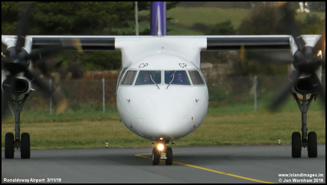'Hi guys' - a head on view of 'CP as it lines up for a runway 08 departure from Ronaldsway.