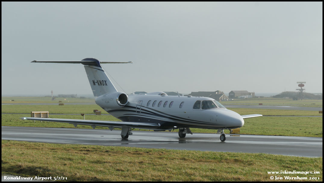 Cessna CitationJet CJ4 M-KNOX taxies for departure from runway 08. This is not the same airframe as the