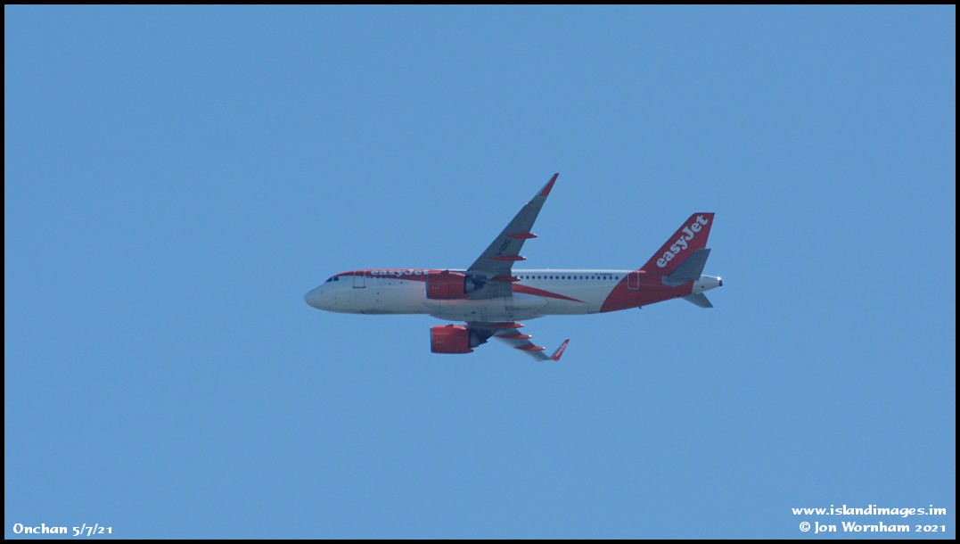 EasyJet Airbus A320 Neo G-UZHZ 'Easy 175' passing over Douglas inbound to Ronaldsway Airport from Belfast. Easyjet have only recently resumed services to the Isle of Man.