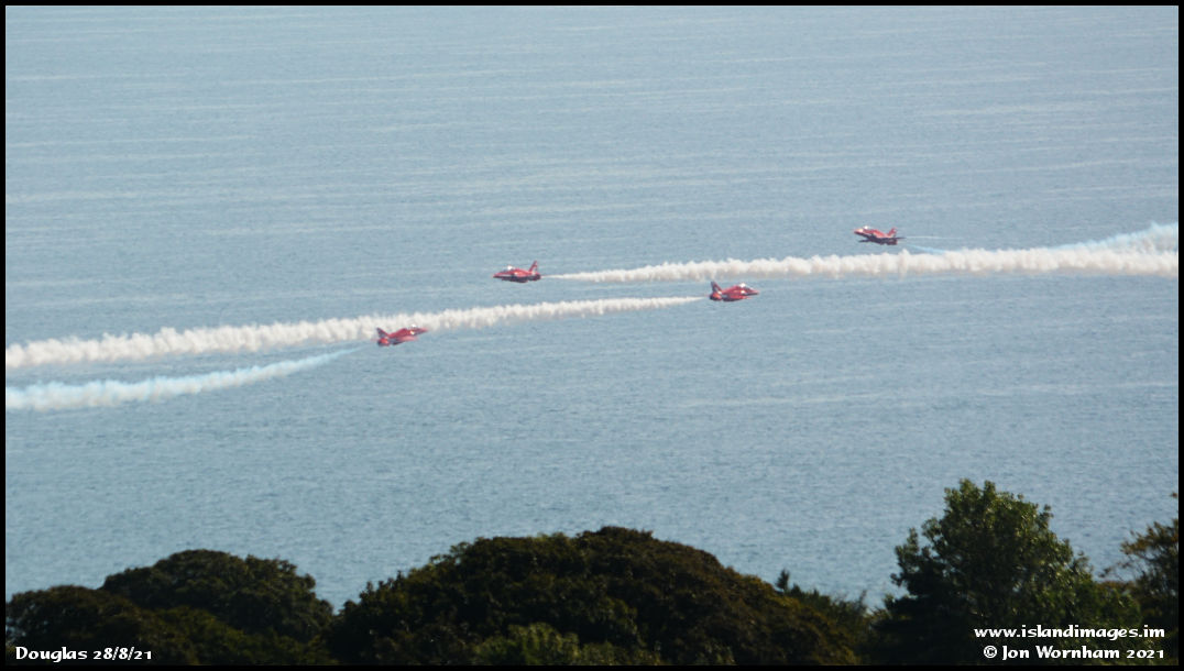 Four jets have now split from the rest and are performing opposite direction passes low over Douglas Bay.