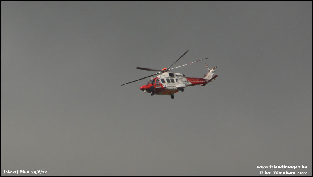 A momentary patch of sunlight illuminates 'Coastguard 199' as it circles the landing pads at Noble's hospital.