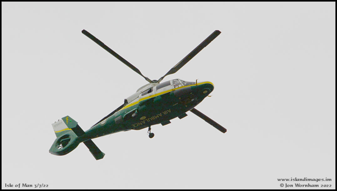Great North Air Ambulance Dauphin II G-NHAD passing Onchan inbound to Noble's Hospital.