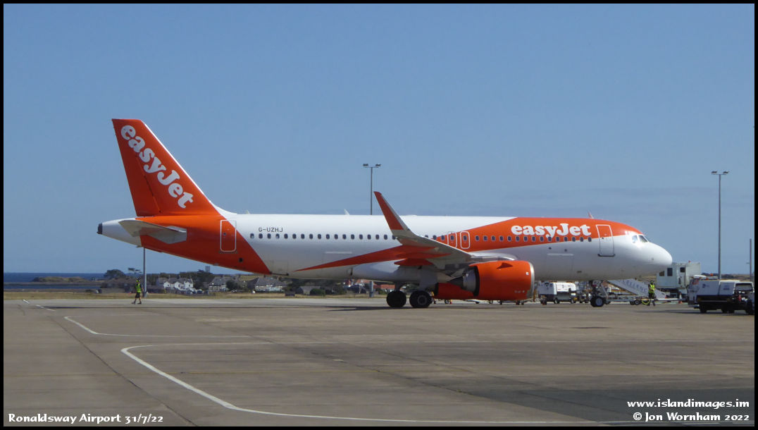 EasyJet Airbus A320 Neo G-UZHJ parked on stand 10 operating a London Gatwick flight.