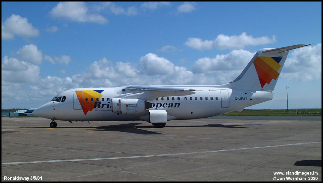 British European liveried 146-200 G-JEAY. Served from 2001 until 2007 and is now also a fire fighting water bomber in the USA with Neptune Aviation Services as
