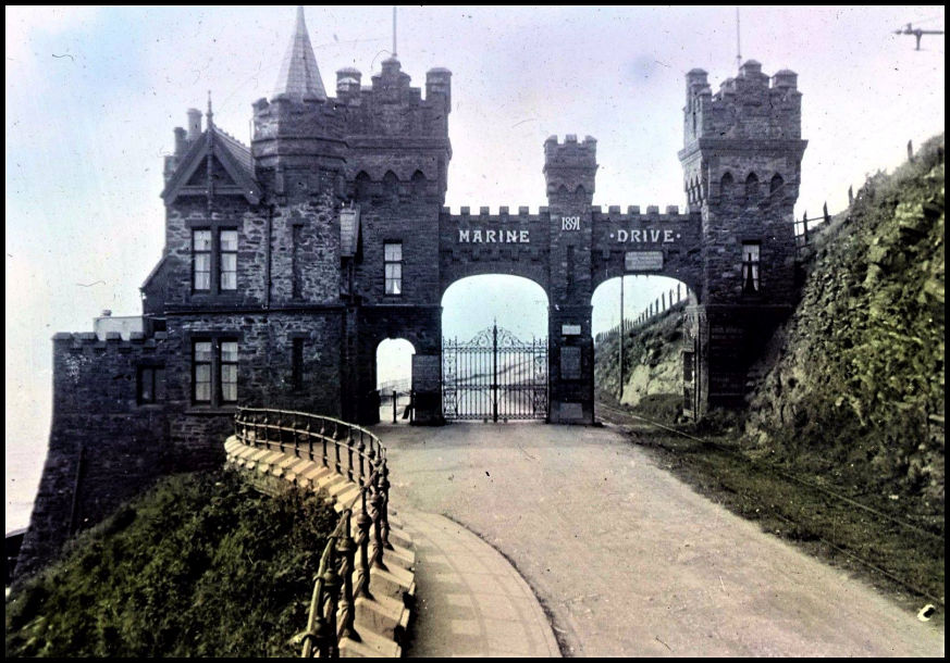 A partially colourised view of the archway, with just the tram gates open. The railings are interesting as it looks like their original height was deemed too low and an additional section had been fixed on top.
