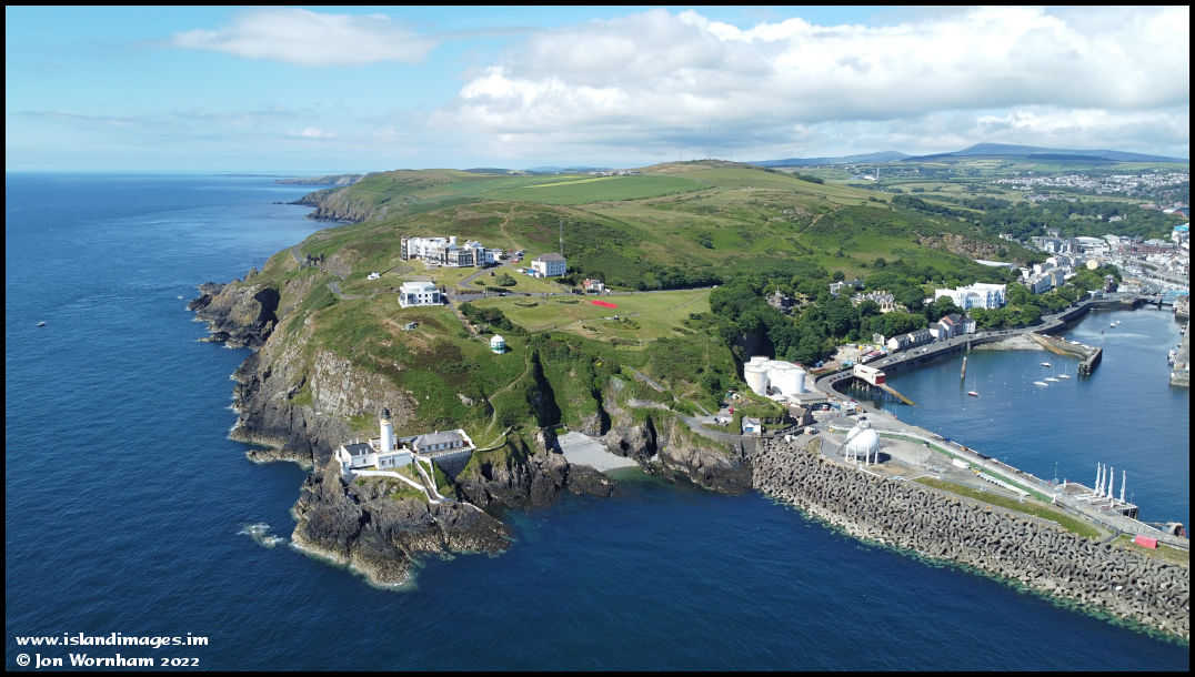 A general view of Douglas Head in June 2021, but no harbour ferry, funicular railway or tramway to Port Soderick. No amusements of refreshments either, but there are picnic tables and the Camera Obscura.