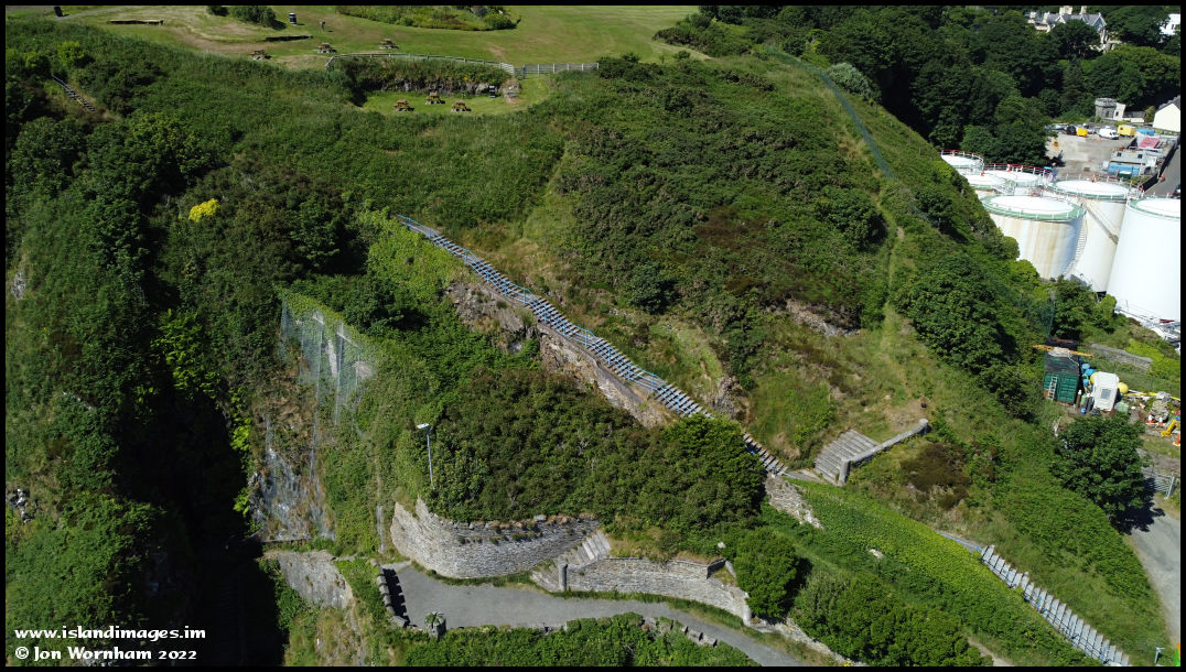 The course taken by the Douglas Head Incline Tramway is now covered by vegetation in this view from June 2021. The line operated from 1900 until final closure in 1953. It ran alongside the stone steps.