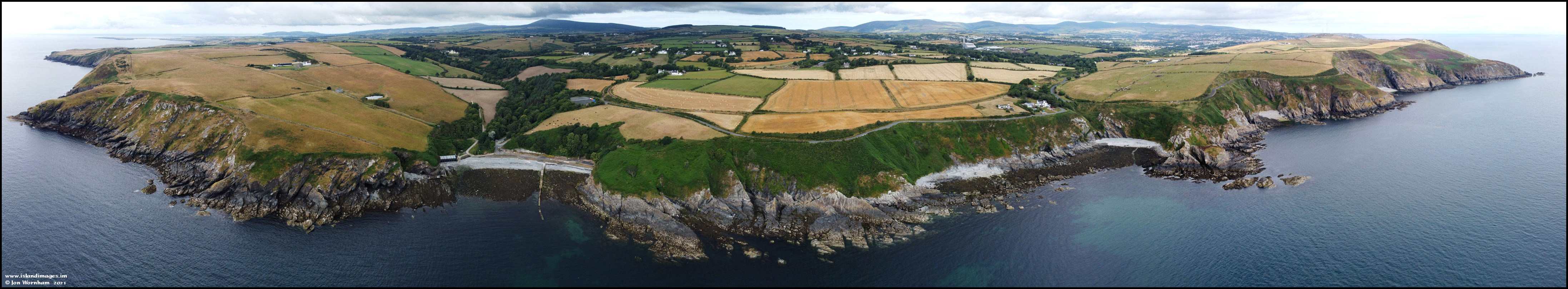 A summertime panorama from over Port Soderick Bay, with the harvest in progress on the fields behind the Marine Drive at Keristal. Coastal elevated walkways extended both to the north and south of the main resort. August 2021.