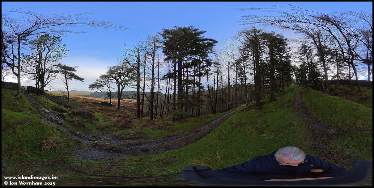A 360 degree panorama at the top end of Tholt-y-Will glen, where the woodlnd opens up onto the moorland with its ruins of the former hill farms.