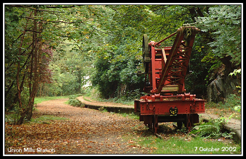 Old hand crane preserved at Union Mills, on the former Douglas - Peel line. Note the double curve of the platform