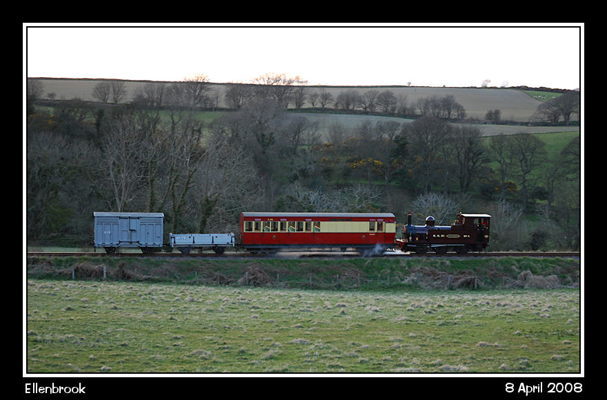 A last view of the mixed train as 'The Caly' eases it carefully down the bank towards Kewaigue