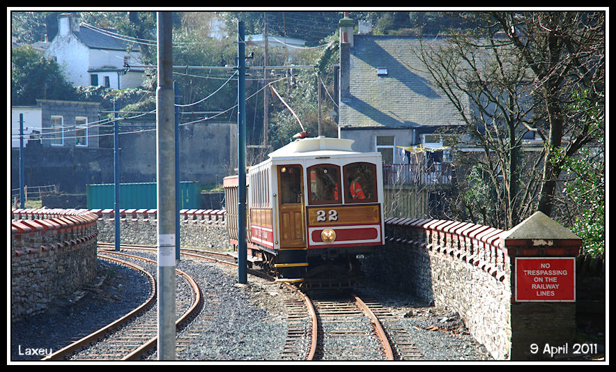 Heading north, in time to catch up with No 22 again as it enters Laxey station over the viaduct