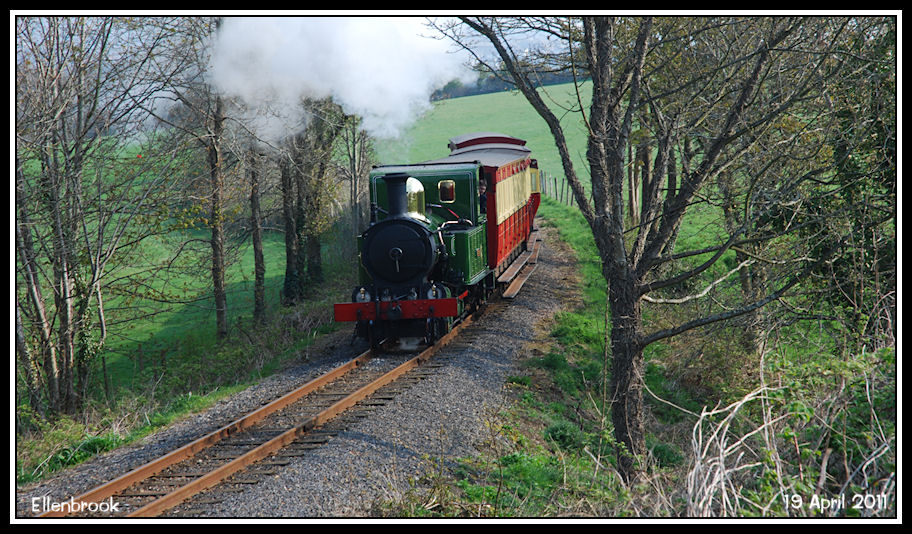 Heading the 09:50 Douglas to Port Erin, No 10 'G.H. Wood' climbs the bank to Oakhill