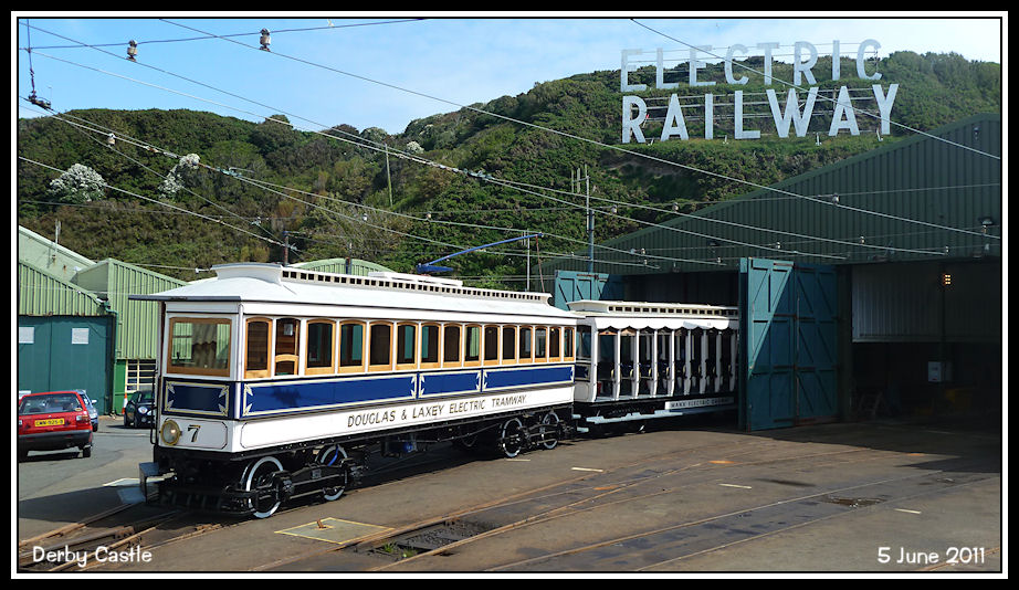 Newly restored Car No 7 outside the depot, ready for a first day in public service wearing a 'Douglas & Laxey Electric Tramway' blue and white colour scheme