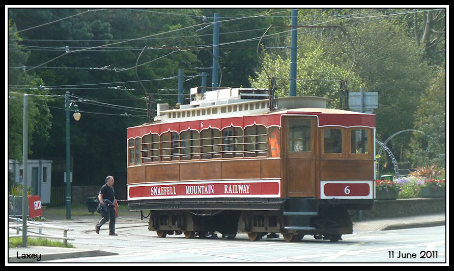 Snaefell Mountain Railway Car No 6 departs, heading for the summit