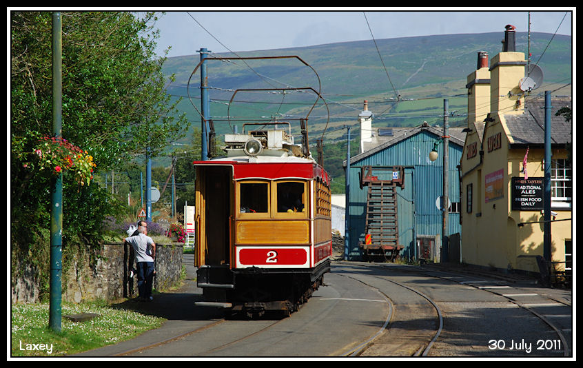 Snaefell Mountain Car No 2 runs into the station. Note the old wooden MER Tower Wagon behind