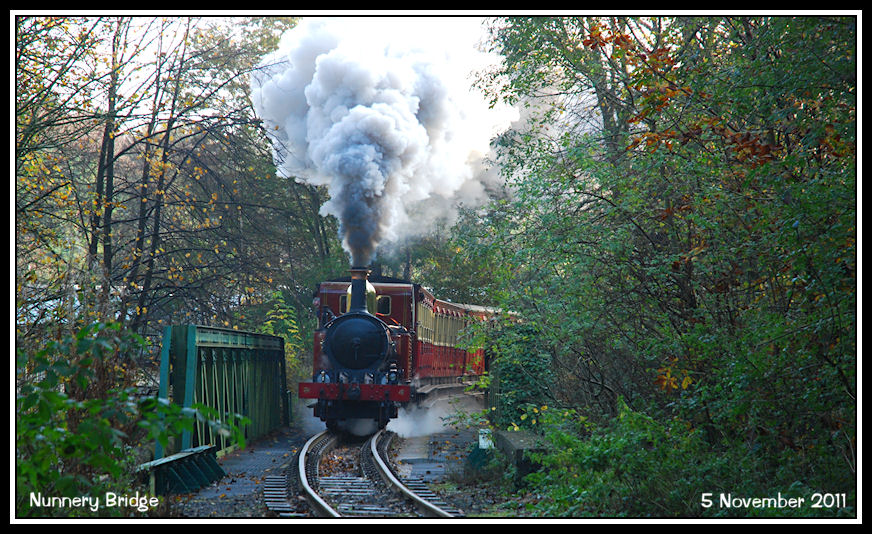 Accelerating ready for the climb up the Nunnery Bank, 'Loch' rattles across the River Douglas bridge