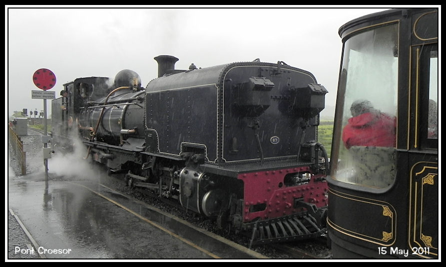 In pouring rain, Welsh Highland Railway Garratt No 87 backs onto the train for Caernarfon