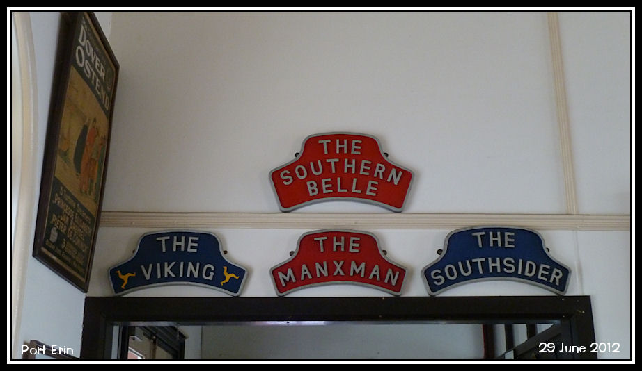 Train headboards on the wall of the booking office