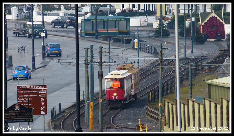 Manx Electric Railway Car No 32 departs from the Douglas terminus on the 11:10 service to Ramsey