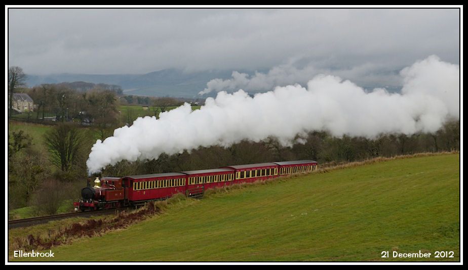 With cloud covered hills as backdrop, No 4 'Loch' climbs away from Douglas with the 11:20 to Port Erin
