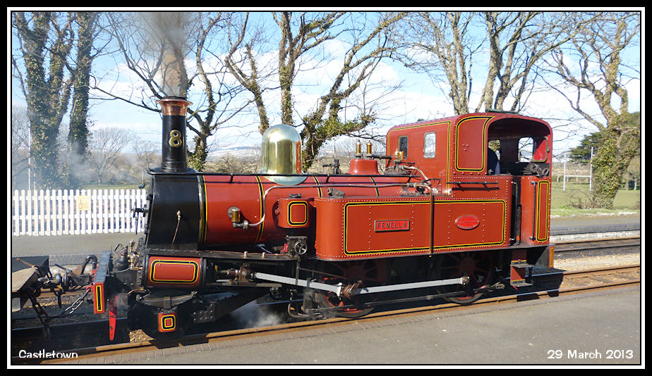 A side on view to show the small boiler and sloping smokebox front carried by 'Fenella'