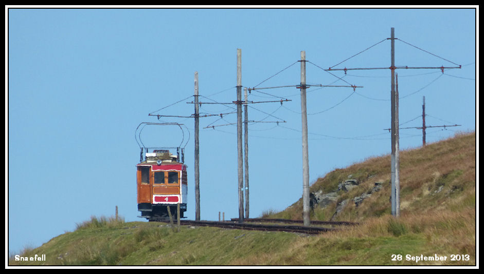 Car No 4 comes into view heading downhill with the 12:10 to Laxey