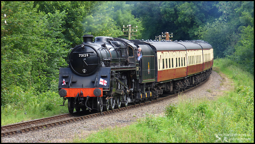 Pictured from outside the engine house at Highley, 4-6-0 73129 heads a Kidderminster - Bridgnorth train into the station