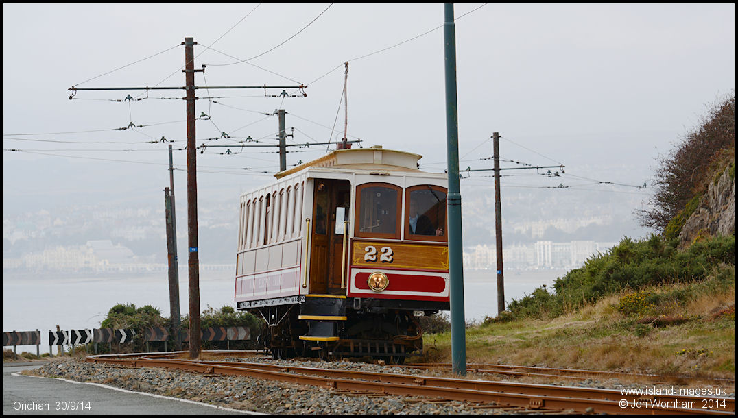 Manx Electric Railway Car No 22 climbs away from a misty Douglas