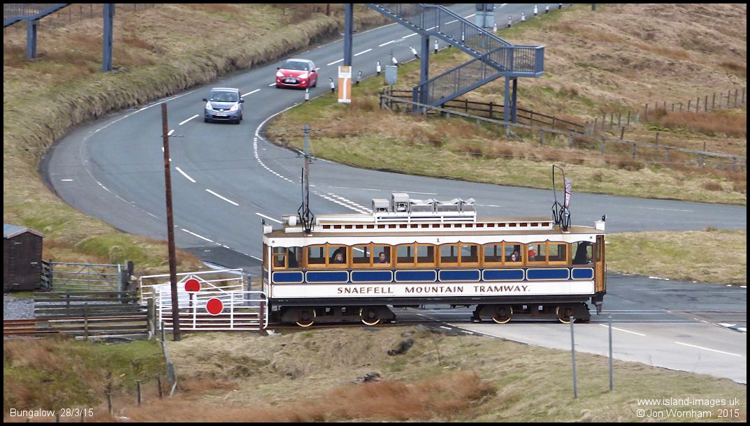 Snaefell Car No1 crosses the Mountain Road heading from Laxey to Summit