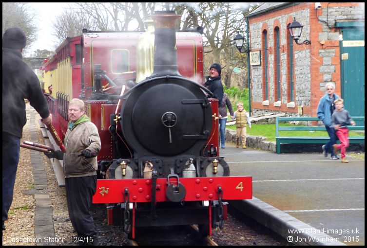 Exchanging single line tokens at Castletown with No 4 'Loch' heading the Port Erin bound train