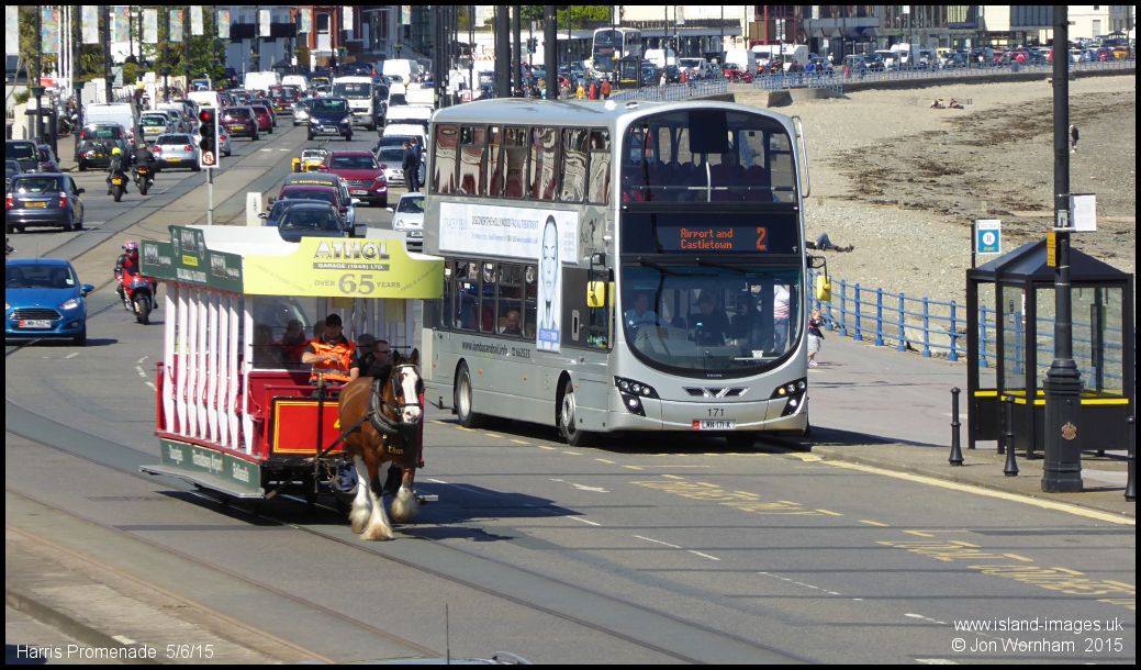 Old and new forms of island transport happily sharing the promenade at the bottom of Broadway during TT 2015