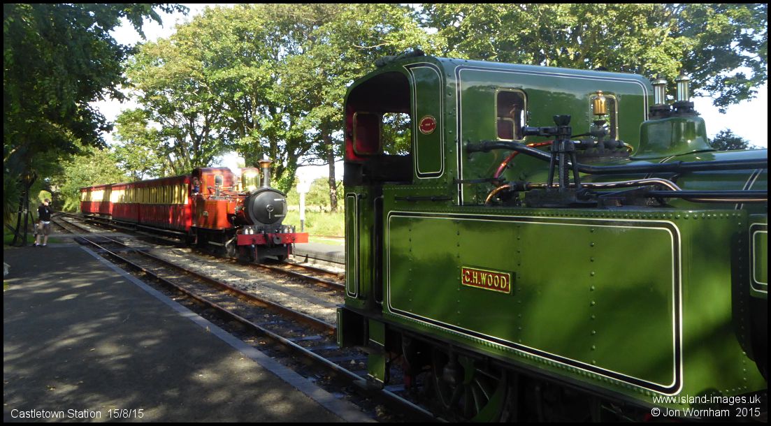 'G.H Wood' waiting for the road as the train from Douglas enters the staion, hauled by No 13 'Kissack'