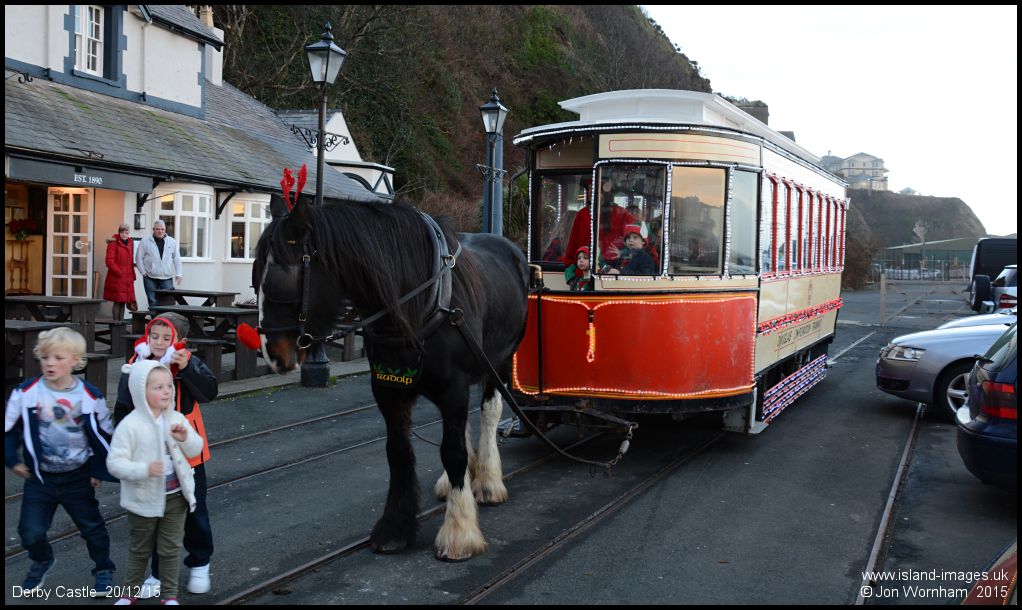 'Santa' trams on the Douglas Horse Tramway, with 'Rudolp' getting ready to head to the Sea Terminal