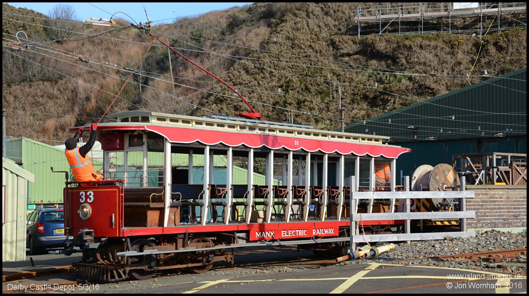 Car No 33 heads back into the Derby Castle depot, needing some careful work with the trolley pole!