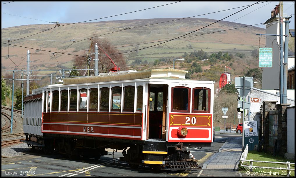 After running around trailer No 47, Car No 20 re-crosses the main road back into the station. The Laxey Wheel is in the background