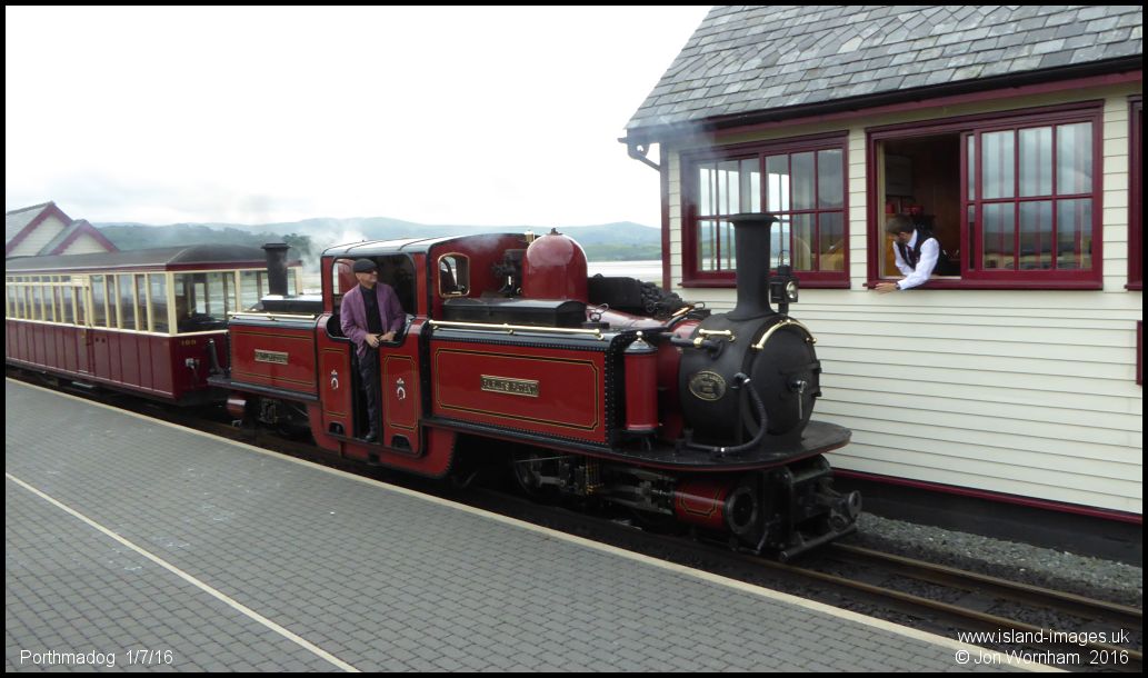 Ffestiniog Railway 0-4-4-0T 'David Lloyd George' runs past the signal box and into the station. This is the newest of the Boston Lodge built 'double Fairlies' being constructed in 1992.