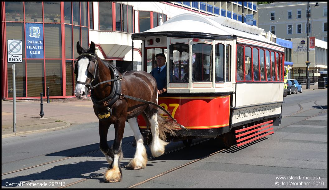 'Charles' and saloon No 27 again, now passing the Palace hotel heading back to the Sea Terminal. The tramcar dates from 1892 and is one of three delivered in that year.