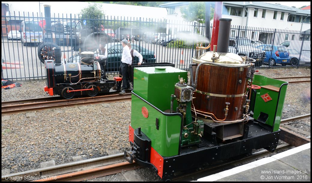 Mixed gauge operations at Douglas station with 'Steamplex' from the 2' guage Groudle Glen Railway and 'Ant' from the 1' 7" gauge Great Laxey Mines Railway