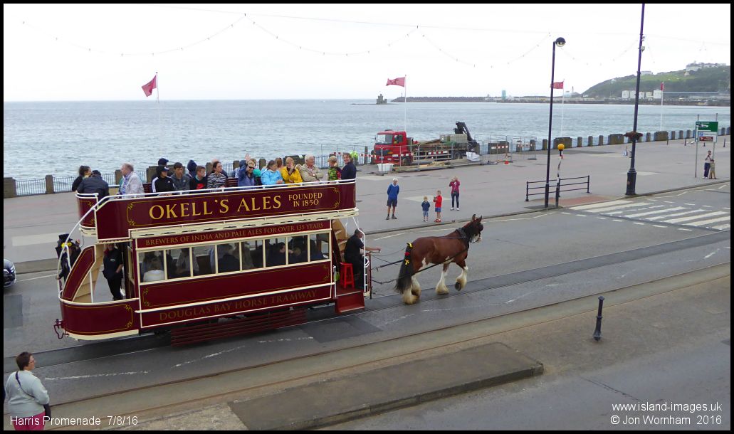 Double deck tram No 18 passing the Villa Marina with the Tower of Refuge behind